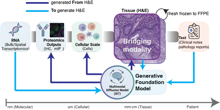 MuPD: Generative Foundation Model for Multimodal Histopathology.We introduce MUPAD, a generative foundation model designed to integrate histological, molecular, and clinical information across multiple modalities. The model was trained on 100 million histology image patches, 1.6 million text-histology pairs, and 10.8 million RNA-histology pairs spanning 34 human organs. Key achievements include significant improvements in image synthesis quality and the ability to perform cross-modal translation tasks like converting standard staining to immunohistochemistry imaging, demonstrating that a single, unified generative model pretrained across heterogeneous pathology modalities can substantially outperform specialized alternatives.