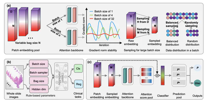 nnMIL: A generalizable MIL framework for computational pathology.We present nnMIL, a generalizable multiple instance learning framework that converts patch-level features from pathology foundation models into slide-level clinical predictions. nnMIL incorporates random sampling at both the patch and feature levels, and employs a lightweight aggregator with sliding-window inference for ensemble predictions and uncertainty quantification. Evaluated across 40,000 whole-slide images spanning 35 clinical tasks and four different foundation models, nnMIL consistently improves over existing methods in disease diagnosis, histologic classification, biomarker detection, and survival prediction, with reliable performance across external cohorts.